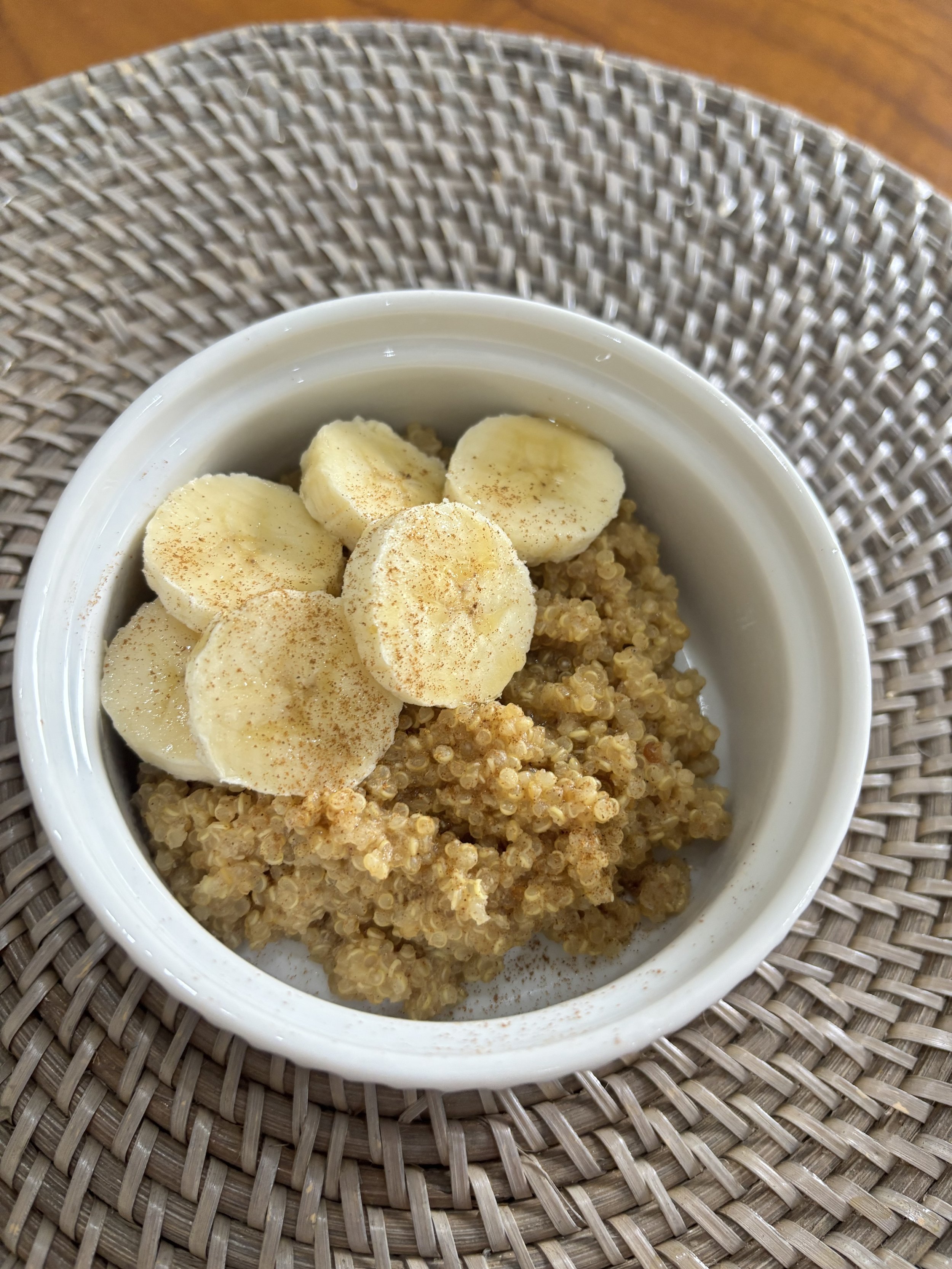 Finalmente, servir caliente. En mi caso, le agregué encima rebanaditas de banano, un poquito más de canela y un chorrito de miel de maple 🤍